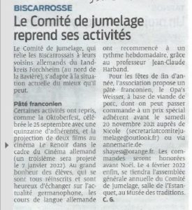 Article Sud Ouest du 9 Novembre 2021 – Le Comité de Jumelage reprend ses activités