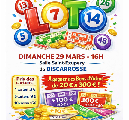 Loto organisé par le Comité de Jumelage Biscarrosse – Landkreis ForchheimBuvette & Restauration sur placeOuverture des portes à 14 hRéservation uniquement par SMS au 06.13.35.21.01
