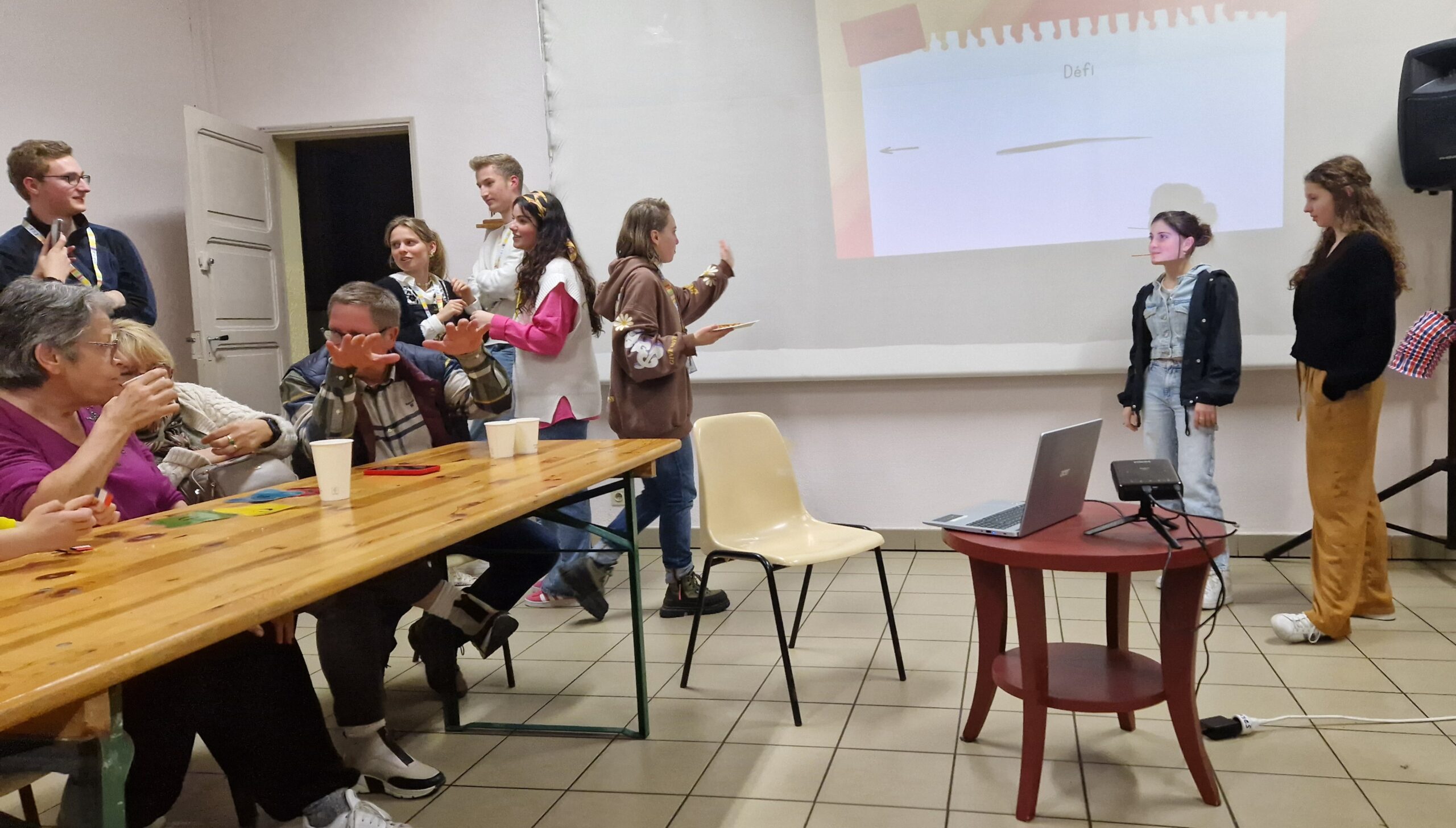 - En deuxième partie, on change la disposition de la salle pour LE QUIZ. Quatre équipes ont été formées parmi les personnes présentes pour évaluer leurs connaissances en culture allemande. Les questions à difficulté variable avaient été judicieusement préparées et présentées (en français !) par Julius et Oke, deux jeunes allemands volontaires au service civique à la maison de l’Europe des Landes depuis quelques mois.