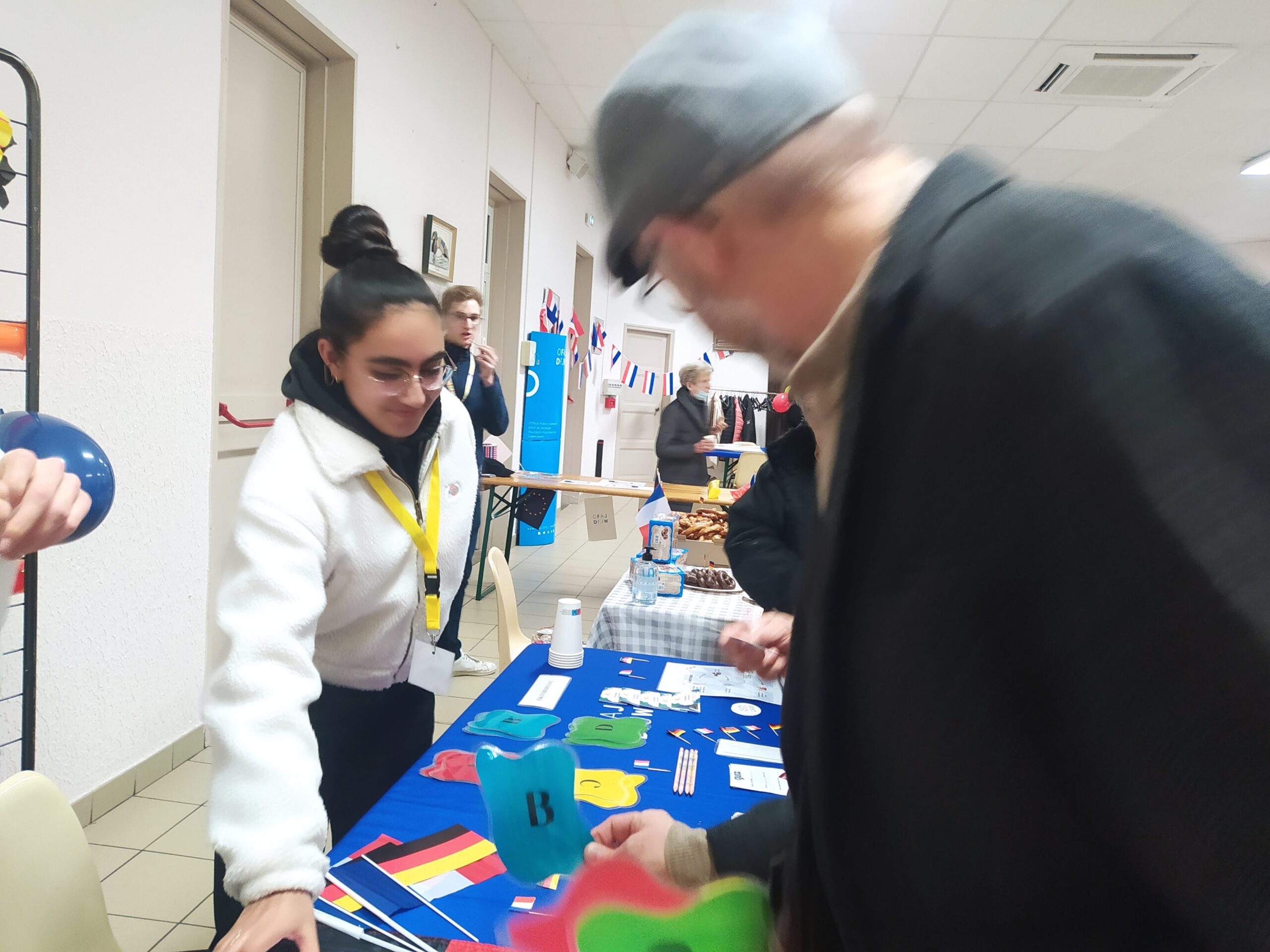 Norah Nadalin, jeune volontaire au service civique à la maison de l’Europe des Landes, était en charge de l’organisation : (Communication, affiches, agencement et décoration de la salle, de l’animation, achats des victuailles (bretzels, saucisses, pain d’épice, moutarde douce, etc. …) :