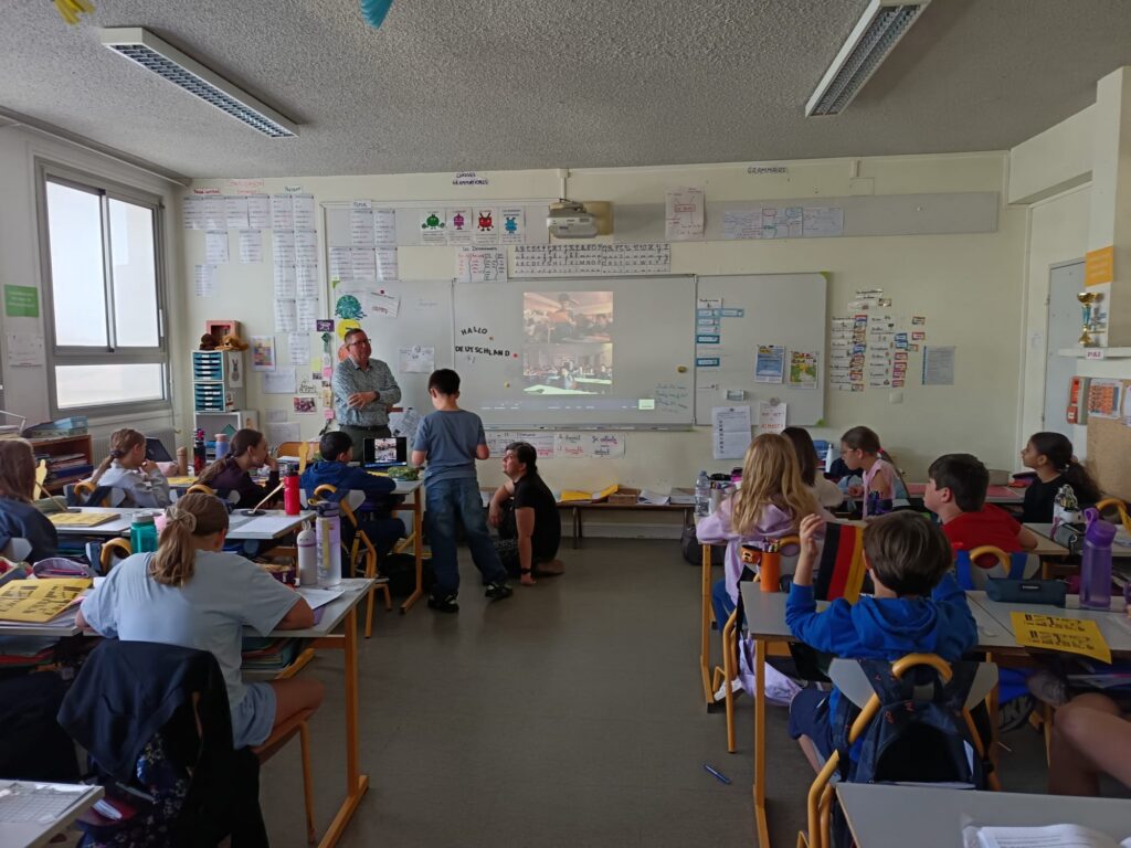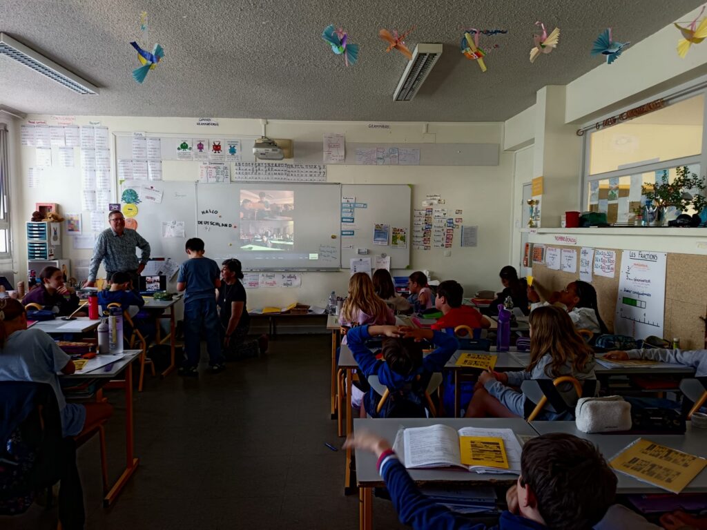Quelques photos prises dans une classe de CM2 de l’école Meyrie lors d’un échange vidéo avec une classe d’enfants de même âge à FORCHHEIM, point d’orgue de l’intervention de Frédérique GAJAC depuis Janvier dans les classes de CM2, et de CM1/CM2 à Meyrie, Petit Prince et Pierricq.